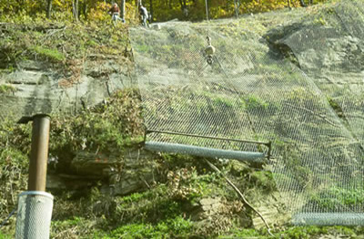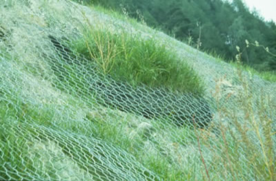 不稳定的岩质山坡下的建筑物存在地质威胁,为了减小原来岩质山坡对建筑和一些设施的潜在威胁,需要对岩质山坡进行防护。在满足工程需要的情况下考虑到与环境生态的效果。在有岩石突出的山坡下面采用挡墙形式。石头可以就近取材,生态格网网箱采用高镀锌钢丝外包PVC材料,PVC覆层采用灰色以便与环境相和谐。山坡下的网箱结构可以有效阻挡突出岩石山坡落下的碎石和滑土,同时格网结构就近取石材,结构与环境融为一体。生态格网结构对基础要求不高,而且便于施工,施工速度快,造价低。安装过程中将多个网箱或网垫绑扎在一起,形成一个均匀的结构,整体性好,能抵挡落石对挡墙结构的冲击。